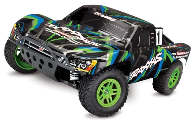 Den populære og ufattelig driftssikre Traxxas Slash får du her i 1/10 skala med firehjulstrekk og børstemotor. Den tar seg godt og effektivt frem på de fleste underlag og vannbestandig elektronikk sikrer bruk året rundt. Kan programmeres til å yte 50% slik at bilen egner seg godt til nybegynnere.