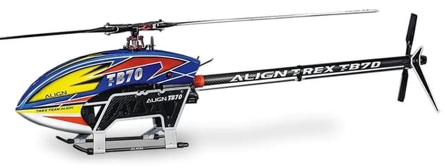 Align T-Rex TB70 er utstyrt med kraftig drivverk og to-blads halerotor, ramme i 3K karbon, redesignet landing skid som er lett og holdbart og ikke minst justerbart tail drive belt som er lett og utrolig sterkt! Batteriene monteres på skinne som slides inn i karbonkroppen og medfølgende elektronikk følger samme høye standard.