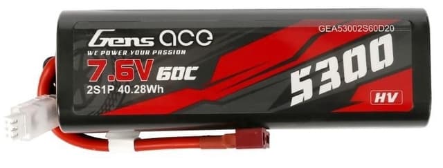 2s 5300mAh - 60C - Gens Ace Hard Case Deans. Dimensjonene er 140x47x25 og passer blant annet: HPI Savage Flux 1/8, Vorza Flux HP, Traxxas Maxx/E-Revo, Slash 1/10, Xray 808E 1/8 og Serpent 811E 1/8. Passer også andre 1/8 og 1/10 biler.Denne pakken er en 7.6V High Voltage versjon. Spesifikasjoner: