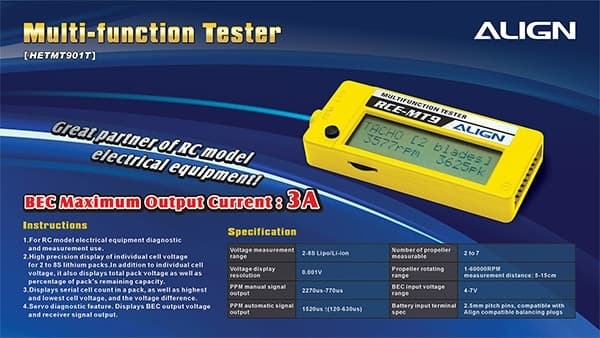 Specs: Voltage measurement range: 2-8S Lipo/Li-ion. Voltage display resolution: 0.001V PPM manual signal output 2270us-770us PPM automatic signal output: 1520us ±(120-630us) Number of propeller measurable: 2 to 7 Propeller rotating range: 1-60000RPM, measurement distance: 5-15cm BEC input voltage range: 4-7v With 3A BEC Output Battery input terminal spec: 2.5mm pitch pins, compatible with Align compatible balancing plugs.
