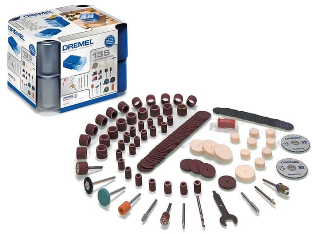 Dette 135-delers universalsettet inneholder et stort utvalg av det mest populære originale Dremel-tilbehøret (inkludert EZ SpeedClic). Tilbehøret leveres i to oppbevaringskofferter som kan settes sammen. Koffertene er utført som moduler som kan settes sammen med lignende Dremel oppbevaringskofferter, slik at du kan lage et større oppbevaringssystem.