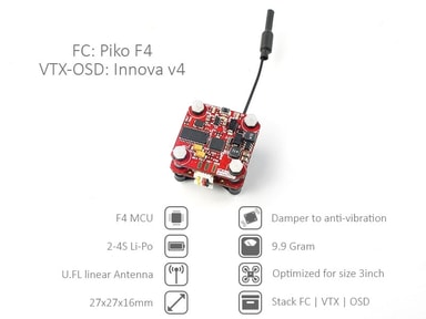 Furious FPV Innova V4 og Piko F4 leveres her i combo. Innova V4 er en videosender og Piko F4 er en black-box flightcontroller for FPV-Racere. Levers som stack som passer i 20x20mm minteringshullfester.Kan benyttes med 4 separate escer eller sammen med 4in1 esc.