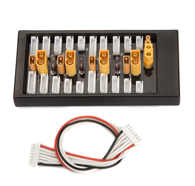 Multiladebrett for 1-6s LiPo-batterier, gir deg mulighet til å lade opp til 4 batterier samtidig på samme lader. Brettet fungerer ved å koble batteriene i parallell slik at laderen håndterer dem som ett stort batteri. Brettet har 40A sikring mellom utgangene (ikke balanseringsutgang). Brettet er beregnet for battereir med XH balanseringskontakt og XT30 /XT60 strømkontakter. Batteriene som skal lades må være like, likt utladet og ha samme antall celler.