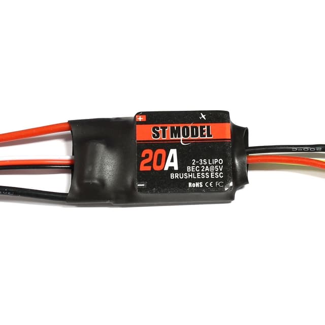 20A regulator for fly, med påloddede 3,5mm hunn-gullkontakter på motorsiden, og T-Plug ( Deans ) på batterisiden. Regulatoren er produsert av Hobbywing.