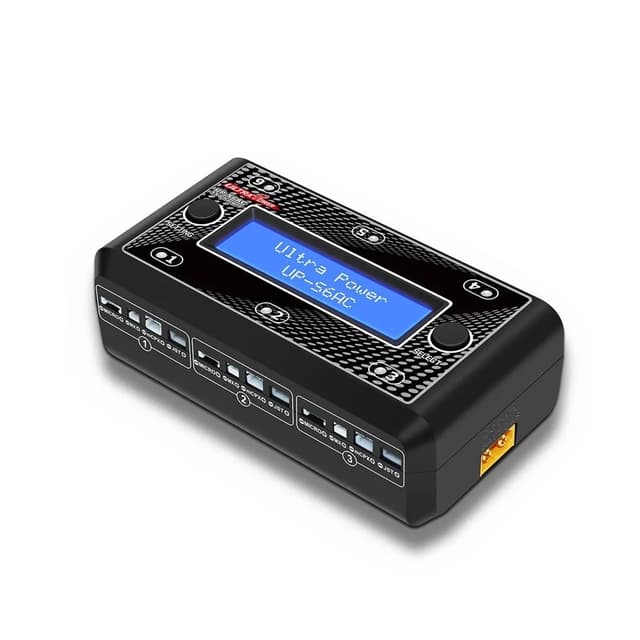Perfekt lader for små 1S batterier til droner, helikopter etc. 6 individuelle kanaler som kan lade 1S lipo på opp til 1A. 4 forskjellige kontakter på hver kanal gjør at de aller fleste batterier støttes. 220V inn eller 7-17V via XT-60 (2-4S lipo) som gir deg muligheten til å lade uten nettstrøm.