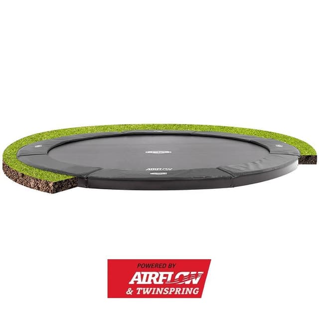 Studier har vist at trampoliner er egnet for personer som trener eller som vil gå ned i vekt. Trampoliner er med andre ord bra for helsen! BERG Champion FlatGround passer perfekt i hagen. Trampolinens stabile ramme er helt nedsenket i bakken. Alt som er synlig er beskyttelseskanten og hopp. På denne trampolinen kan du gjøre enkle, lette hopp siden trampolinen er utstyrt med TwinSpring-fjærer som får deg til å hoppe bedre og en AirFlow-hoppeduk for høyere hopp. De spesialdesignede, støyreduserende stroppene sørger for at luften under trampolinen slippes ut og at beskyttelseskanten ikke treffer hoppeduken. Det spiller ingen rolle hvilken du velger - med en BERG Champion FlatGround velger du kvalitet.• Airflow-hoppeduken gir 50 % mer luftstrøm. Dette gir bedre hoppekomfort og høyere og mer fleksible hopp!• Siden TwinSpring Gold-fjærene er plassert vinkelrett, er de ekstra lange og bevegelige uten å gjøre hoppeoverflaten mindre.• Ekstra sikker takket være den tykke kantbeskyttelsen i polyvinylklorid (PVC)• Den patenterte rammen er enkel å montere og sette på plass.• Kantbeskyttelsens unike stabilisering sørger for at den ikke slår mot rammen.• Trampolinen senkes på en fin måte i hagen og gjør den veldig enkel å gå opp på.