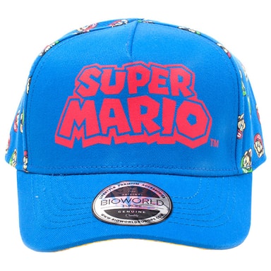 Blå og rød buet caps med Mario og Luigi-mønster og Super Mario-tekst på forsiden. 100 % bomull. Omkrets på 53 cm.