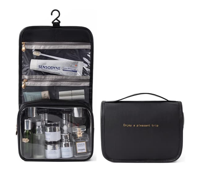 Smart oppbevaring: En vegghengt toalettmappe er perfekt å ha i kofferten. Pakker opp til en liten størrelse og brettes ut til en praktisk ""vegghylle"" hvor du har praktisk tilgang til alle dingsene dine.