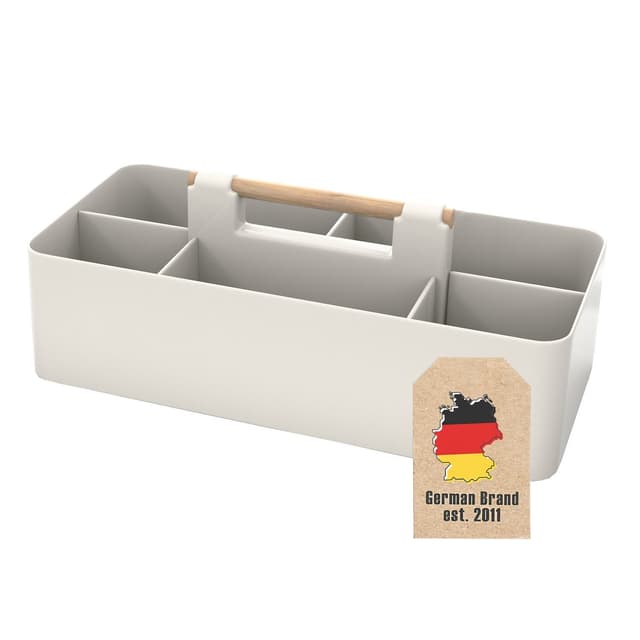 for å oppbevare småting som penner, små blokker, sakser og mye mer. Boksen kan også hjelpe deg på kjøkkenet til for eksempel å oppbevare kryddershakere, kokekar eller småpakker.Arrangøren er utstyrt med et håndtak som gjør at du raskt kan snu boksen slik at du enkelt kommer til alle rom. Det er et hulrom under håndtaket slik at du til og med kan stable flere bokser oppå hverandre. Dette betyr at du sparer mye plass.