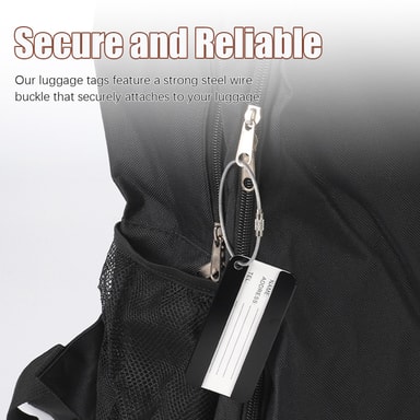 Trygg og pålitelig: Med en sterk ståltrådspenne festes bagasjemerkene sikkert til bagasjen din, og sikrer at informasjonen din forblir på plass under hele reisen.