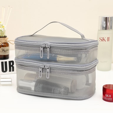 Denne store kapasiteten dobbeltlags mesh kosmetikkvesken i grå er perfekt for å organisere sminke og toalettsaker. Dens pustende mesh-materiale og dobbeltlagsdesign gjør den ideell for både reise og hjemmebruk, og sikrer at tingene dine holder seg...Les mer om produktet