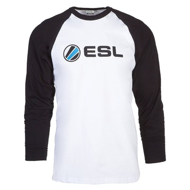 Tofarget genser i sort og hvit klassisk baseball-stil med ESL-logo, spesielt designet for fans av Electronic Sports League. Størrelse XL.