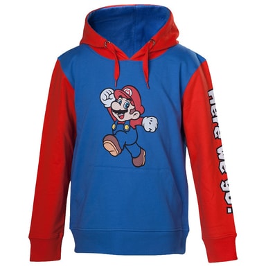 Rød og blå hettegenser for barn med Mario-trykk foran og Here We Go på venstre erme. Lomme foran. 50% bomull og 50% polyester, barnestørrelse 110-116 (høyde i cm).