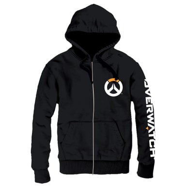 Sort hettegenser med glidelås og Overwatch-logo i front og på ermet. To sidelommer og elastiske ermeavslutninger. Størrelse M, som tilsvarer størrelse EUR 50.