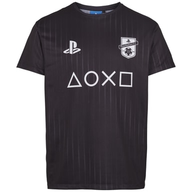 Sort T-skjorte med PlayStation-logo, PlayStation FC-logo og kontrollerikoner på forsiden. Ideell til eSports. 100 % polyester, størrelse L, tilsvarer europeisk størrelse 52.