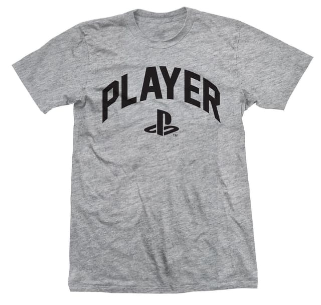 Grå T-skjorte med liten sort klassisk PlayStation-logo og "Player" i store bokstaver. 100% bomull, størrelse XL.Les mer om produktet