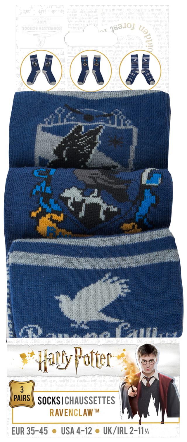 Vis hvilket hus du tilhører med Hogwarts sett med 3 par sokker. De tre parene med sokker i størrelse 35-45 har farger og emblem fra Ravnklo-huset.