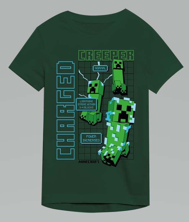 Officielt licenseret minecraft t-shirt med unikt charged creeper-tryk. T-shirten skiller sig ud fra mængden og vækker uhyggeligt gode minder hos enhver der er bekendt med fjenderne fra det ultra-populære minecraft-univers.