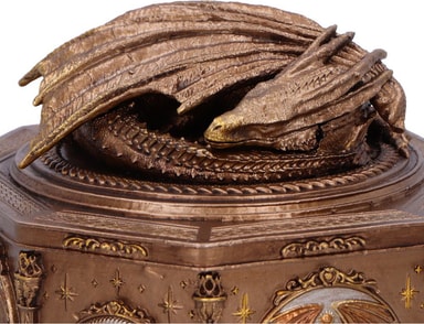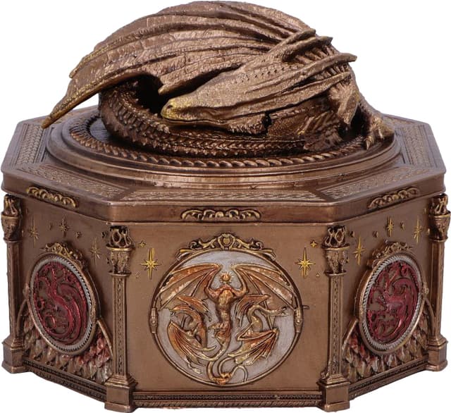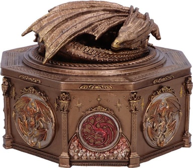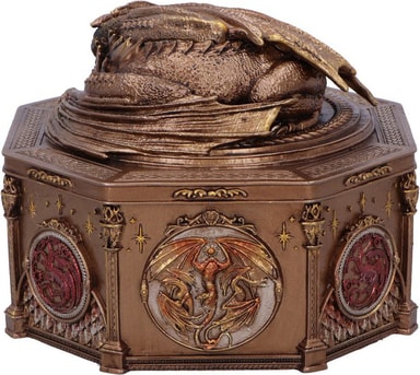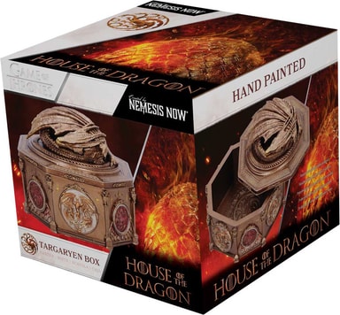 Nemesis Now House of the Dragon Syrax boks er en oppbevaringsboks som viser prinsesse Rhaenyras drage, Syrax. Den detaljerte polyresinfiguren av Syrax ligger sammenkrøllet oppå det avtakbare lokket, og den er håndmalt med metalliske detaljer.