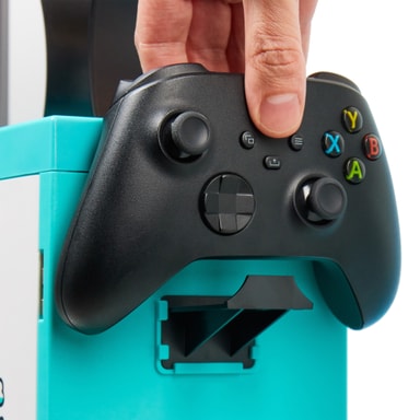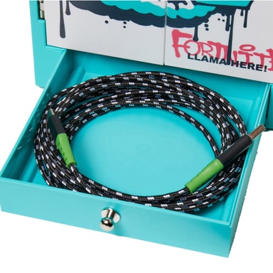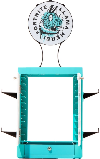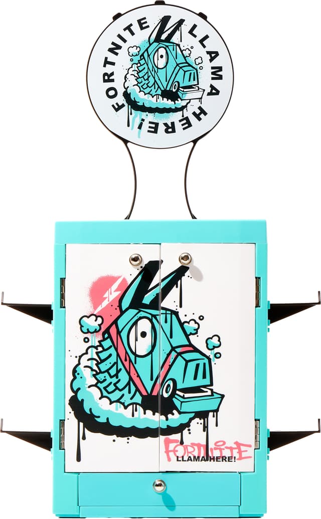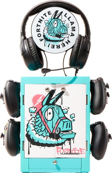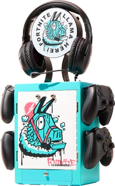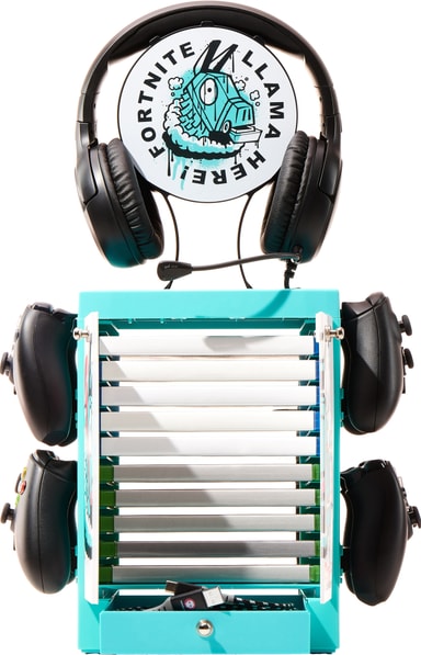 Numskull Fortnitespillskaper en plassbesparende organisering som kan romme 10 spill/filmer, 4 kontrollere og et headset på toppen. Det har et design med lama-tema, en nederste skuff for kabler og justerbare innvendige hyller.