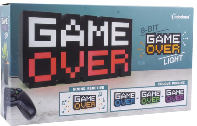 Lys opp rommet om natten med Play Game Over lampe. Den har et Super Mario-tema, er 30 cm bred, USB-drevet og laget av Breakdown Platic. "Over"-delen av lampen endrer farge, mens "Game"-delen holder seg hvit.