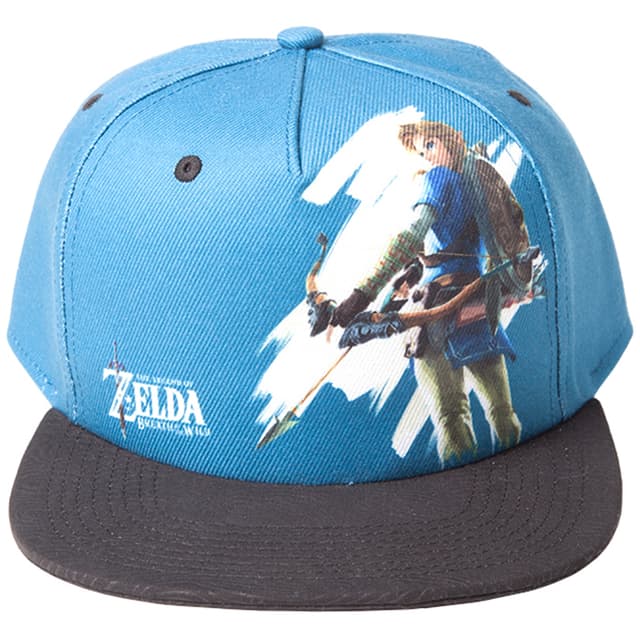 The Legend of Zelda: Breath of the Wild blue snapback cap with Link character on the front. 100% polyester, universal size.