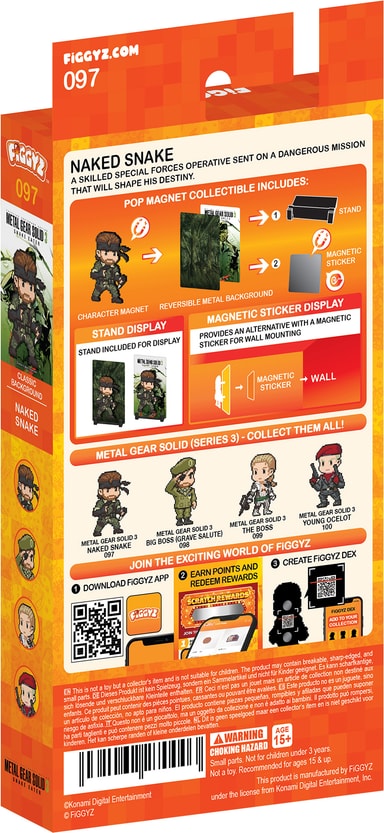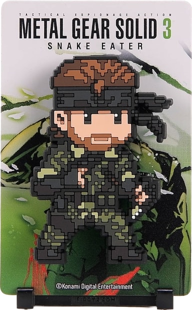 First 4 Figures Figgyz Metal Gear Solid 3 Pop Magnet actionfigur har en reversibel bakplate av metall for to visningsmuligheter, en pixel-stilart karakter, 3D magnetisk pop-out- effekt, displaybase, og et magnetisk klistremerke.