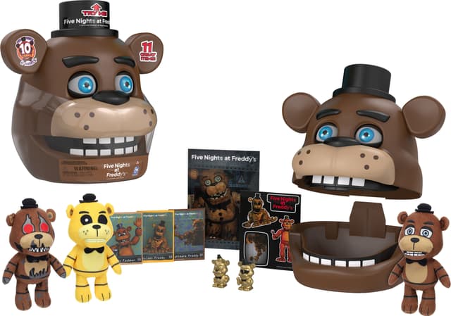Play Five Nights At Freddy's leketøysett består av et stort Freddy Fazbear-hode som kan åpnes for å få tilgang på en samling leker, som Freddy Fazbear Plush, Golden Freddy Plush, Nightmare Freddy, samlekort, og små figurer.