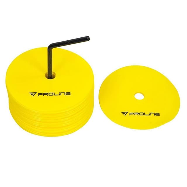 Sett med 20 flate markører i klar gul farge. En flat markør for treningshjelp. 20-pakning 15 cm Helt flat design Sterke farger Slitesterk plast Materiale: Gummi/Vinyl
