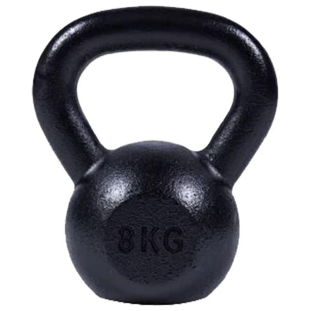 Svart støpejern kettlebell tilgjengelig i vekter fra 4 kg til 32 kg. Denne modellen finnes også i fargene gull og sølv/grå. Denne kettlebellen er støpt i ett stykke, har en flat base for stabilitet og vektmerking foran.
