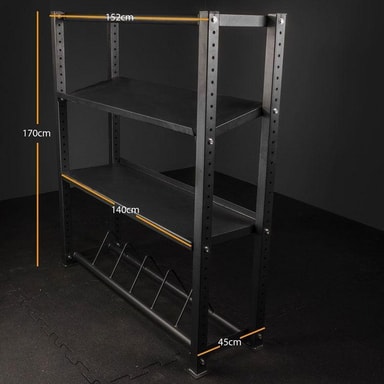 Med Thor Fitness 'hyllesystem lager du din egen hylleoppbevaring. Tilpass hyllen etter dine egne ønsker og suppler fritt med hyller for forskjellige verktøy. Velg mellom hyller som passer til manualer, kettlebells, vektplater og baller.
