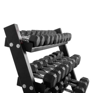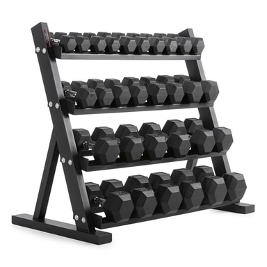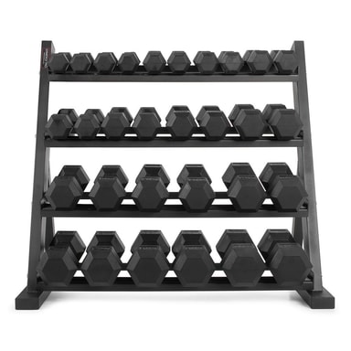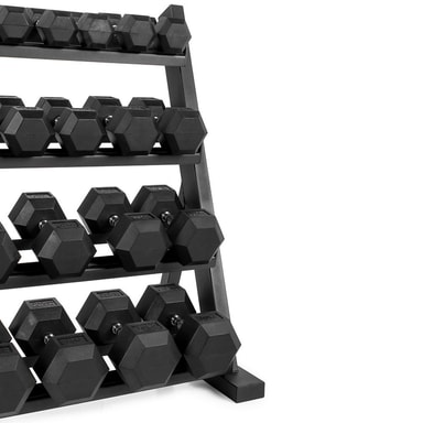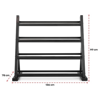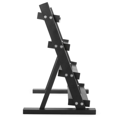 Et robust stativ i stål til alle slags dumbells. Det lutende designet gjør det enkelt å legge dine dumbells på plass. Med 4 etasjer har du god plass til hele settet.Les mer om produktet