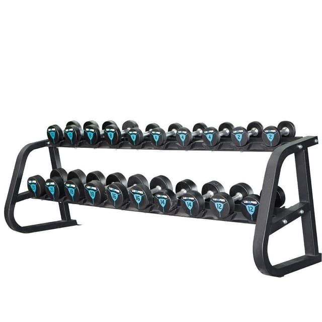 Robust og holdbar manualstativ for 10 par manualer. Designet for krevende kommersiell bruk av treningsstudio og er utstyrt med en robust stålprofil. Stativet tåler mange tyngre manualer (opptil 900 kg). Hanteklemmene er laget av gummi for å holde vektene på plass og beskytte både stativet og manualene. Stativet passer til manualer i standardstørrelse med avrundede ender. Hvis du leter etter et holdbart og stabilt hantelstativ for flere par manualer, er Livepro hantelstativ det trygge valget. Spesifikasjoner Dimensjoner (L x B x H): 245 x 73,5 x 79 cm