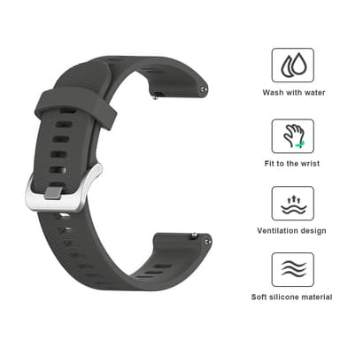 Sporty silikonreim som passer til Garmin Forerunner 245 og andre sportsklokker med 20 mm bredde. Stroppen er laget av mykt og vannavstøtende materiale med mange ventilasjonshull som lar huden puste. Det føles behagelig rundt håndleddet og er perfekt som reim til en sportsklokke.