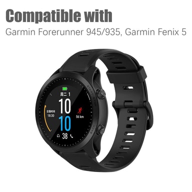 Myk og slitesterk sports-klokkereim laget av vannavstøtende silikon. Stroppen er 22 mm bred og passer til Garmin Forerunner 945 / 935 og Garmin Fenix 5. Reimen er enkel å skifte, verktøy er inkludert.