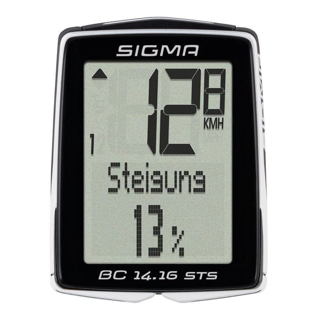 BC 14.16 STS sykkelcomputer er designet for deg som leter etter en trådløs datamaskin for å måle ytelsen din. Sykkelcomputer med 14 funksjoner og inkludert kadenssensor. De mange høydemålerfunksjonene inkluderer blant annet en kurve over høydeprofilen og en visning av hellingsgraden i %. Funksjoner Distansemåling Delvis avstand (sykkelturens avstand). Total distanse (siden installasjonen av sykkelcomputeren). Total distanse for 2 sykler. Separat kilometerteller med manuell start og avslutning. Hastighetsmålerfunksjon Nåværende hastighet. Gjennomsnittlig hastighet på sykkelturen. Maksimal hastighet på sykkelturen. Hastighetssammenligning (indikerer om gjeldende hastighet er under eller over gjennomsnittshastigheten på sykkelturen). Tidsfunksjon Tidtakerklokke (tid for sykkelturen). Total treningstid (siden installasjonen av sykkelcomputeren). Total tid for 2 sykler. Nåværende tid. Høydemålefunksjon Gjeldende høydenivå. Justerbar starthøyde. Maksimal høyde. Total høydeforskjell oppoverbakke. Total høydeforskjell oppoverbakke for flere sykler. Hellinggrad uttrykt i prosent. Høydeprofil. Kadensfunksjoner Kadens. Gjennomsnittlig kadens. Inneholder Holder for styret: ATS/STS 2032. Hastighetssender: STS. Kadens-sendersett: STS. Veldig kraftig magnet. 2 O-ringer for montering (Ø 35 mm, 45 mm).