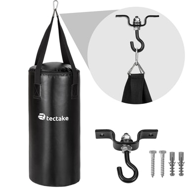 Boksesettet fra tectake er det ultimative fitnessutstyr til hjemmebruk. Et treningsprogram med bokseputen gir en effektiv trening for hele kroppen. Treningen kan fint utføres i egen bolig, uten at man behøver å dra til treningssenteret. Man kan lett finne et godt hjørne til bokseputen fordi den ikke behøver så mye plass. Med boksesekken kan du øve slag som Hook, Kryss og Jab. Til bokseputen følger det med takmontering og et par boksehansker i størrelse 6 med bred borrelåslukking for god komfort. Dessuten er det også håndleddsbandasje med i settet.