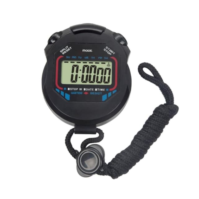 En digital tidtaker med stor digital skjerm som viser sekunder, minutter, timer, dager, datoer og måneder. Stoppeklokken viser hundretalls sekund.