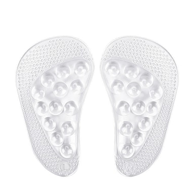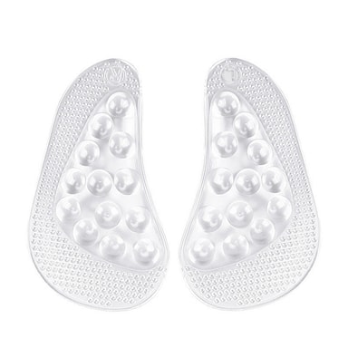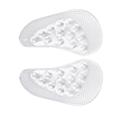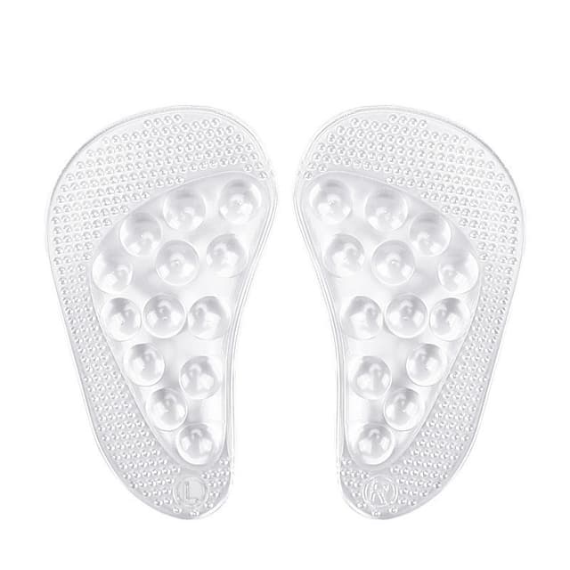 Komfortable og pustende: Laget av et mykt og fleksibelt GEL-materiale, gir disse innleggssålene eksepsjonell komfort hele dagen. Den pustende designen tillater luftsirkulasjon, og holder føttene kjølige og tørre selv under langvarig bruk. Det gjennomsiktige materialet blander seg sømløst med skoene dine, og gjør dem diskrete og usynlige.