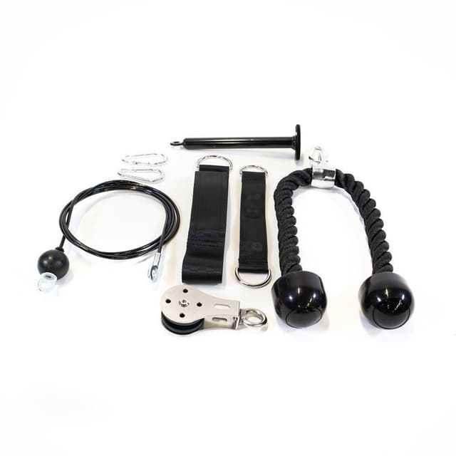 Pulley system som gjør at du kan trene som på treningssenteret bare at du gjør det hjemmefra. Systemet kan festes på mange måter, eks i ett chins rack, trappen eller i takbjelken. Systemet holder alle slags vektskiver over 21 mm i omkrets . Lengde på kabel 197 cm Vektholder 21 mm omkrets Inkluderer triceps tau
