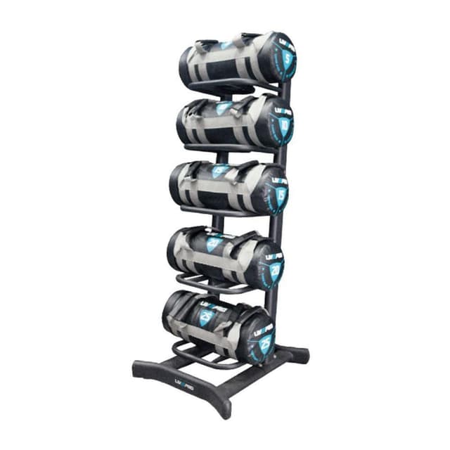 Praktisk stativ for Livepro Warrior Power treningssekker. Stativet har plass til opptil 5 sekker. Det grove stativet i matt svart metall er stabilt i bruk. Klipsens interne støtte forhindrer at vektene brettes i midten, posene holder seg godt balansert og kan vises. Spesifikasjoner Dimensjoner (L x H x B): 86,5 x 153 x 59 cm Farge: Svart