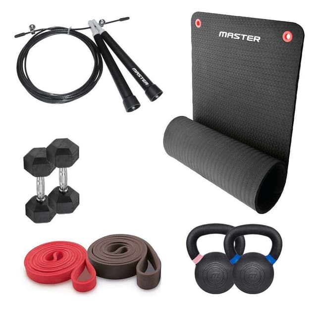Dette hjemmetreningssettet tilbyr alle verktøyene du trenger for å trene kondisjon, mobilitet og styrke uten å måtte forlate hjemmet. Takket være variasjonen i vekt og motstand kan du selv bestemme hvor hardt du vil trene og få muligheten til å utvikle styrken. Settet består av følgende: 1 x MASTER FITNESS FITNESSMATTA PRO 1 x MASTER FITNESS SPEEDROPE SVART 1 x 2-14 kg MASTER FITNESS POWERBAND 1 x 5-23 kg MASTER FITNESS POWERBAND 1 x 8 kg MASTER FITNESS BC EDITION, KETTLEBELL 1 x 12 kg MASTER FITNESS BC EDITION, KETTLEBELL 2 x 8 kg MASTER FITNESS GUMMI / KROM, HEXHANTEL 2 x 10 kg MASTER FITNESS GUMMI / KROM, HEXHANTEL