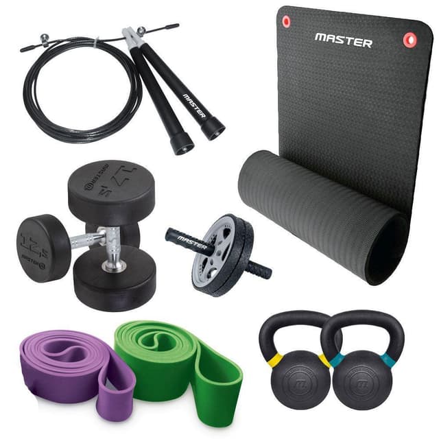Dette hjemmetreningssettet tilbyr alle verktøyene du trenger for å trene kondisjon, mobilitet og styrke uten å måtte forlate hjemmet. Takket være variasjonen i vekt og motstand kan du selv bestemme hvor hardt du vil trene og få muligheten til å utvikle styrken. Settet består av følgende: 1 x MASTER FITNESS FITNESSMATTA PRO 1 x MASTER FITNESS SPEEDROPE SVART 1 x MASTER FITNESS AB WHEEL 1 x 12-35 kg MASTER FITNESS POWERBAND 1 x 20-50 kg MASTER FITNESS POWERBAND 1 x 16 kg MASTER FITNESS BC EDITION, KETTLEBELL 1 x 20 kg MASTER FITNESS BC EDITION, KETTLEBELL 2 x 12,5 kg MASTER FITNESS GUMMIHANTEL PREMIUM 2 x 17,5 kg MASTER FITNESS GUMMIHANTEL PREMIUM