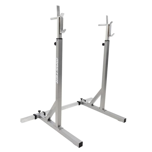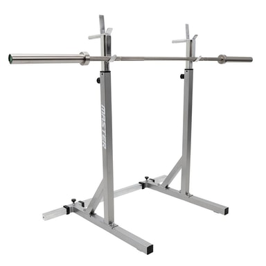 Egnet for benkpress, knebøy og dips. Justerbar høyde med sprint. Maksimal bredde: 130 cm