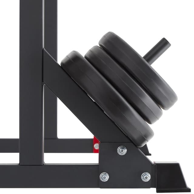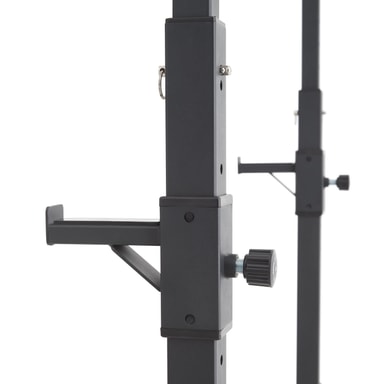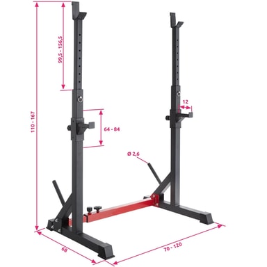 Med Ivan knebøy stativ fra tectake har du det perfekte utstyret for effektive vektstangøvelser. Takket vøre justerbarheten i høyde og bredde, kan det kompakte knebøyestativet tilpasses alle personer og hver øvelse. Den solide stålrammen med de stabile føttene og de to elastiske dumbbell vektstativene, garanterer maksimal sikkerhet under trening. To praktiske braketter på baksiden holder vektplater organisert - så Ivan knebøy stativ sørger også for orden i treningsstudioet ditt.