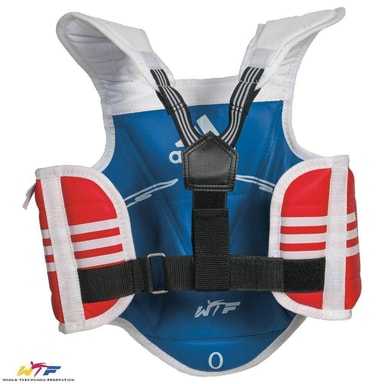 Reversibel kamp for Taekwondo trening og konkurranse. Designet for barn. Lett å ta av og på med hjelp av velcro ende på baksiden. Laget i kunstig skinn.