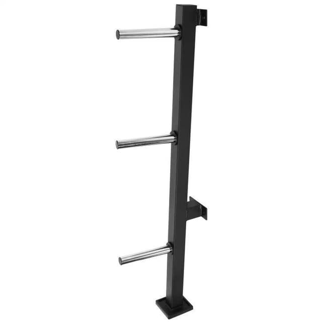 Vektstativ i sort med tre stolper som er tilpasset vektskiver med hulldiameter på 31mm og 51mm og tåler en maksimal belastning på 300kg. Vektstativ for veggmontering: Maksimal lastekapasitet: 300 kg Maksimal lastekapasitet per stolpe: 100 kg Passer til vektskiver med hulldiameter på 31mm og 51mm Dimensjoner Bredde: 13 cm Høyde: 112 cm Dybde: 34 cm Lengde på hyllene: 20cm Avstand mellom gulv og første hylle: 26cm Avstand mellom første og andre hylle: 43cm Avstand mellom andre og tredje hylle: 35 cm Egenvekt (30/31 mm): 5 kg Egenvekt (50/51 mm): 7 kg