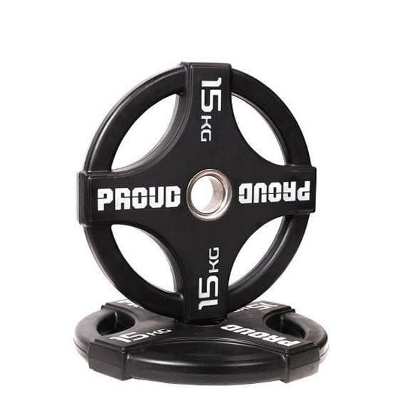 PROUD Rubber Weight Plates 2.0 har et overflatelag av gummi for å beskytte vektskivene og dempe lyden på en effektiv måte. De fire fleksible grepene i vektskivene gjør at vektskivene er lette å håndtere og at de også kan brukes i andre øvelser.