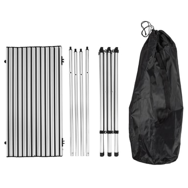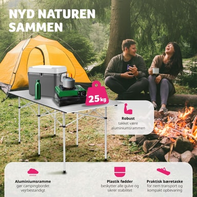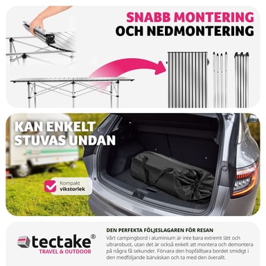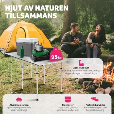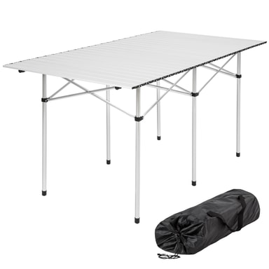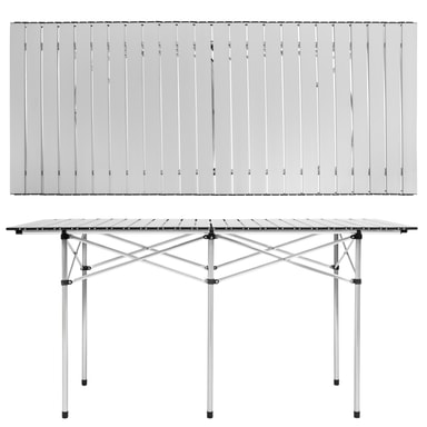 Dette praktiske aluminiumsbordet kan brukes fleksibelt, i hagen, på stranden, festivaler, campingutflukter, overalt der du trenger et bord som er lett å transportere og montere. Bordet monteres takket være sin praktiske sammenlignbare stomme og overflatelamellene i en håndvending. I den medfølgende bærevesken kan bordet oppbevares kompakt og også enkelt transporteres.