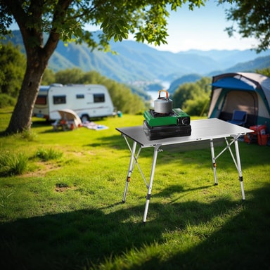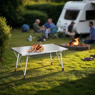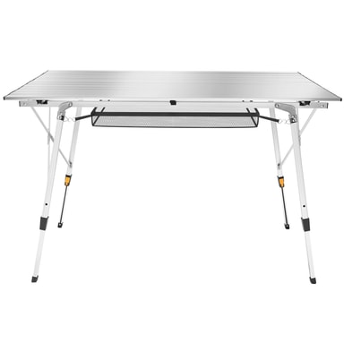 Det sammenleggbare campingbordet i aluminium Bastian fra tectake, et must-ha-tilbehør for friluftsentusiaster, blander sømløst funksjonalitet med stil. Perfekt for camping, piknik og festivaler, dette bordet er et essensielt campingmøbel. Det sammenleggbare designet, supplert med en transportbag, gjør den til et praktisk valg for de som setter pris på plassbesparende løsninger i et lite telt. Laget av værbestandig aluminium, den er ideell for alle utendørs omgivelser, sammen med telt, soveposer og annet campingutstyr. Med justerbare ben tilpasser den seg til variert terreng, noe som gjør den egnet for bruk med campingstoler. Dette allsidige bordet hever ikke bare campingopplevelsen din, men er også nyttig for barnas utendørsaktiviteter. I tillegg holder det ekstra nettet tilbehør som klær og små piknikartikler innen rekkevidde, og de gulvvennlige plasthettene tillater innendørs bruk. Et verdifullt tillegg til samlingen av campingmøbler, Tina-bordet tilbyr både kvalitet og rimelighet, noe som gjør det til et smart valg for de som søker praktisk uten å gå på kompromiss med stilen.